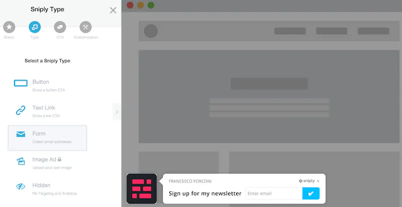 Dopo aver creato il brand puoi passare a creare una call-to-action. Sniply permette di creare call-to-action di vario tipo: con un pulsante, con un link, con un form ad un solo campo (ad esempio un form per l’iscrizione alla tua newsletter), con un immagine oppure una call-to-action “hidden” da utilizzare solo come tracciamento.