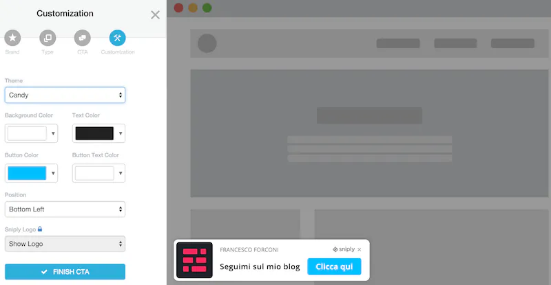Per ogni call-to-action dovrai selezionare il brand cui si riferisce e quindi il logo che verrà inserito. Potrai scegliere il testo da inserire e il link dove reindirizzare gli utenti che cliccano sul pulsante. Infine potrai scegliere la forma e personalizzare i colori dei vari elementi che la compongono.